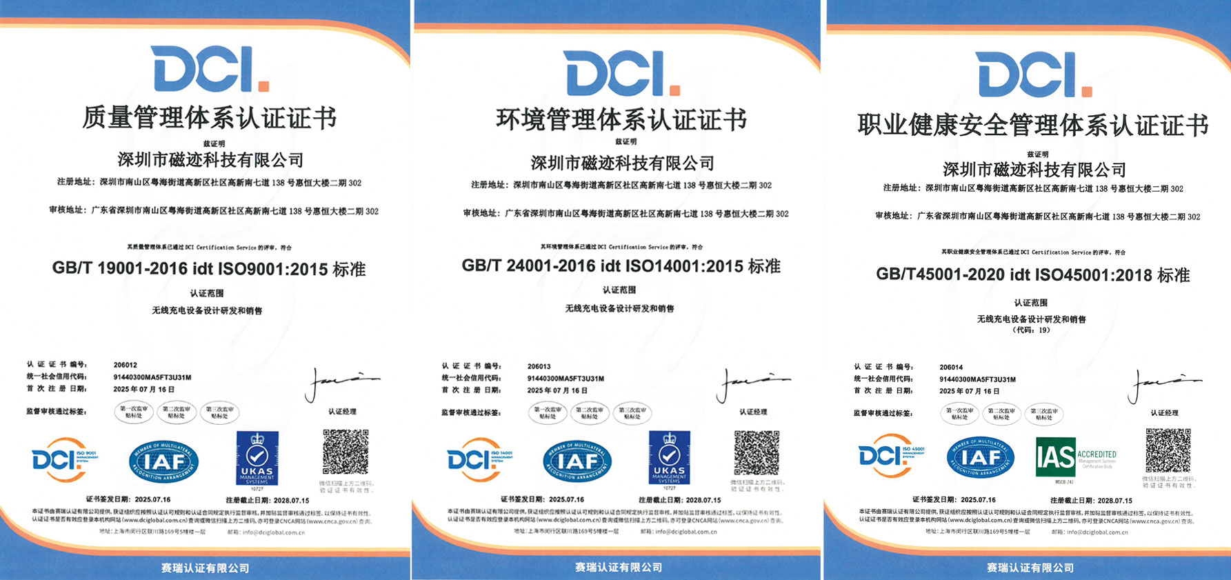 打开微信扫一扫深圳市磁迹科技有限公司于2025年7月16日成功通过ISO9001:2015;ISO14001:2015;ISO45001:2018标准认证;同时获得GB/T19001-2016;GB/T24001-2016;GB/T45001-2020标准及IAF、UKAS、IAS等标识。