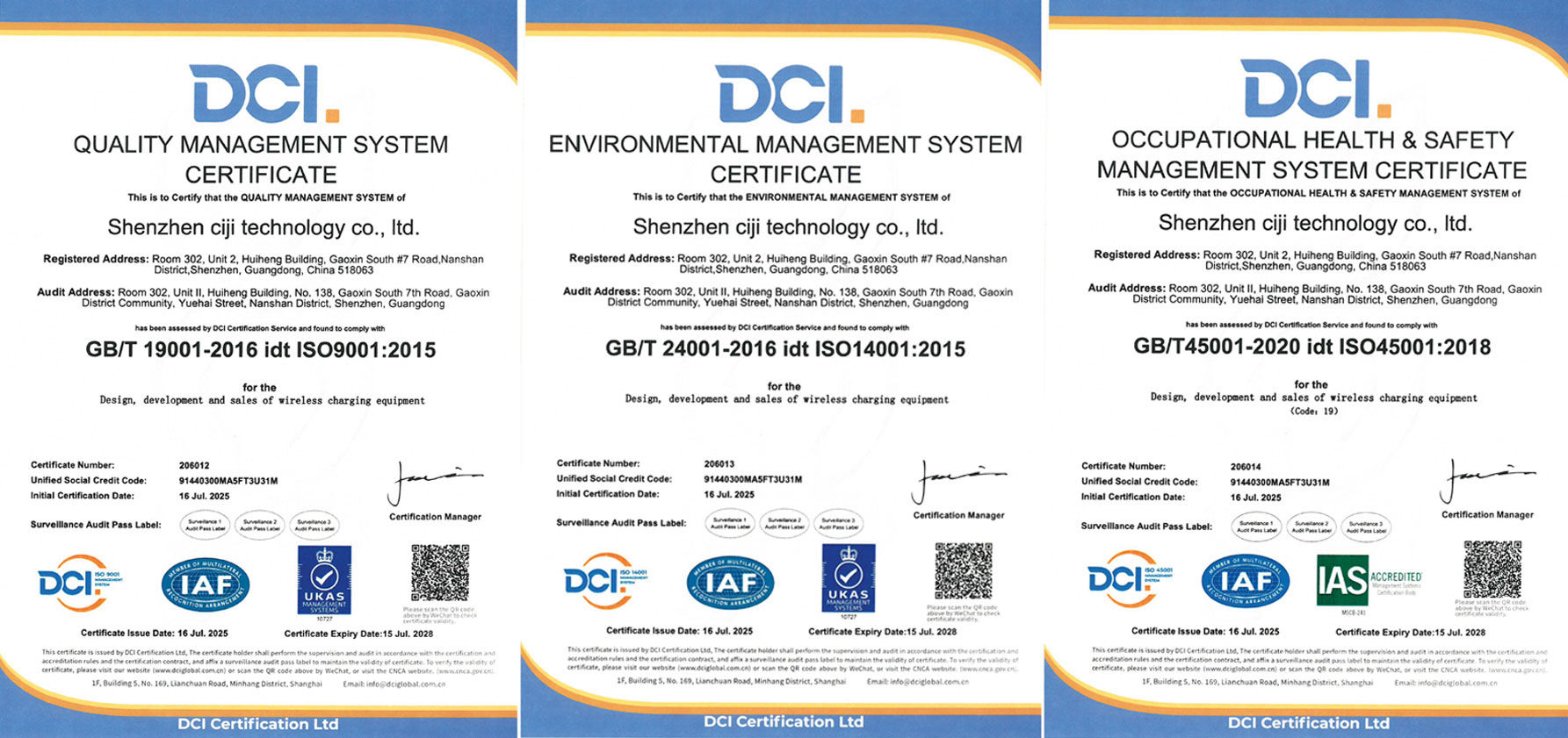 自磁迹科技实施ISO各项标准以来,在各运营中不断改进流程;对于风险识别和控制的学习与实施也让生产过程和工作环境显著受益。这也意味着我们正在用更高的标准要求为指导,让研发与生产各流程融入国际主流,为客户提供更加安全、高效、便捷的无线充(供)电设备和产品,与供应商、与客户共同成长。